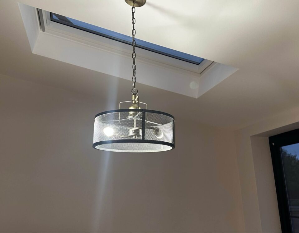Elegant pendant light suspended beneath a skylight, blending crisp illumination with architectural style.- Client