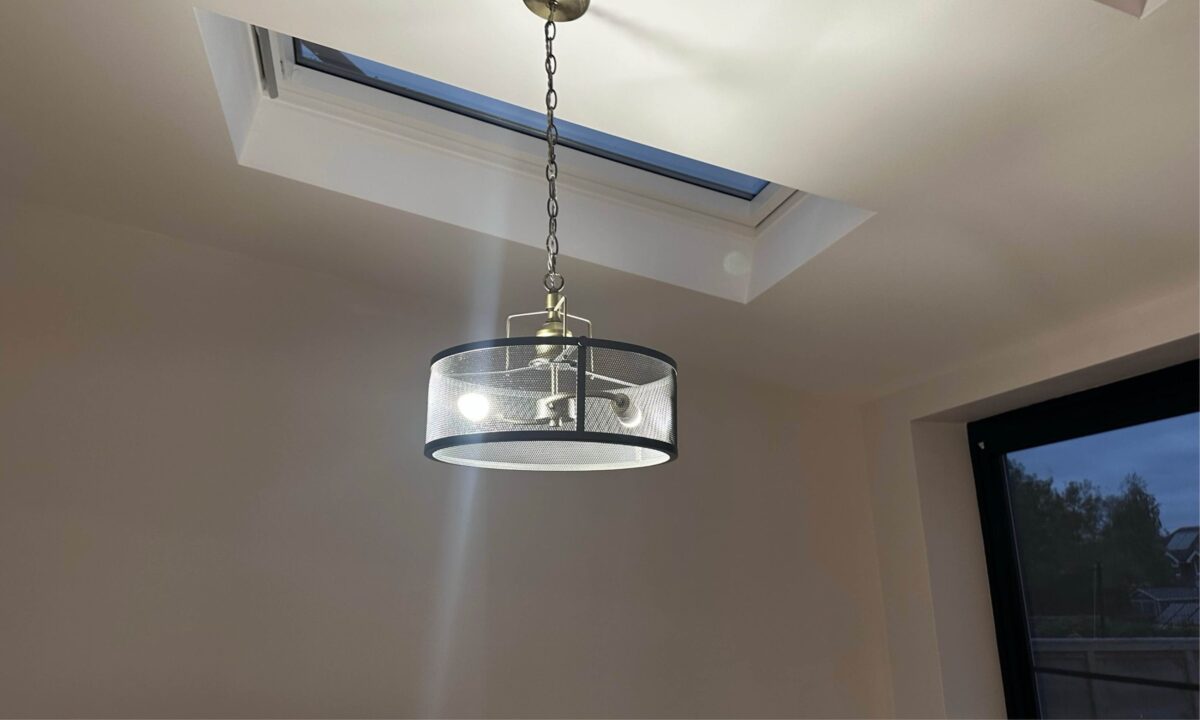 Elegant pendant light suspended beneath a skylight, blending crisp illumination with architectural style.- Client
