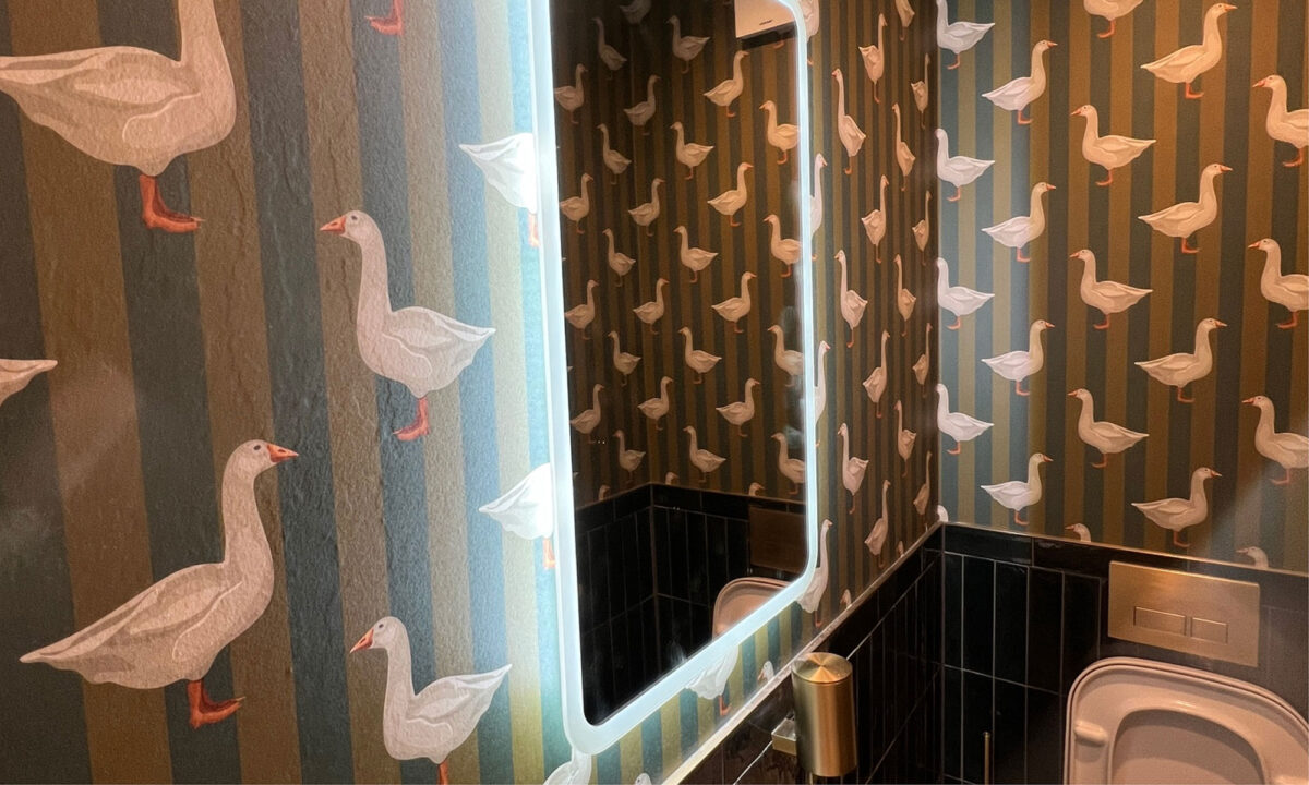 LED backlit mirror and ambient accents bring a designer touch to this chic, wallpapered bathroom.- Date