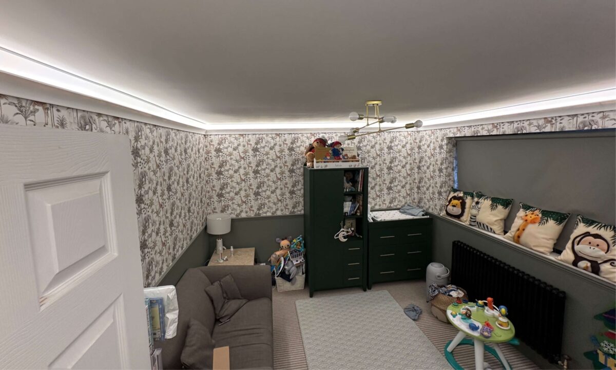 Discreet LED coving casts a soft glow, setting a calm and contemporary mood in this refurbished living space.- Client